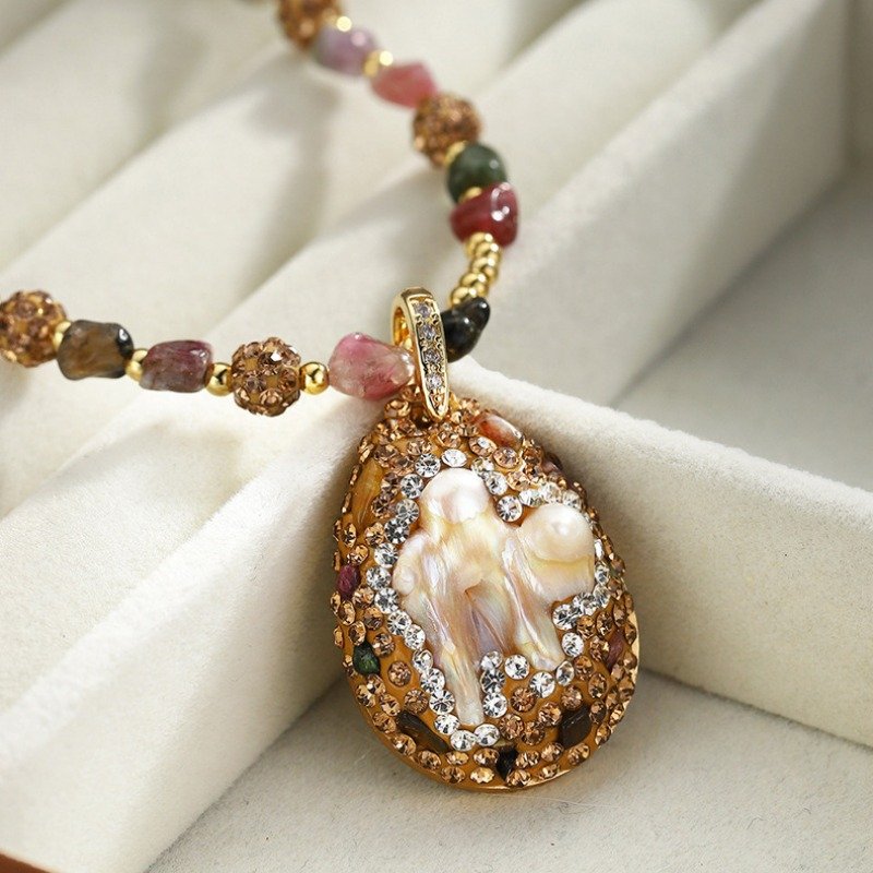 Baroque Pearl Pendant Necklace for Women – Natural Tourmaline Beads with Mother of Pearl Cameo, Handmade Vintage Style Statement Jewelry, Adjustable 16-20 inch