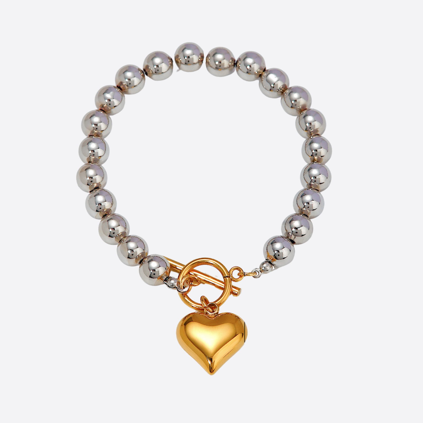 The Bold Heart Bracelet wraps your wrist in high-polish silver spheres, grounding you with rhythm. At its center: a sculpted golden heart. Heavy. Present. Unapologetically bold.