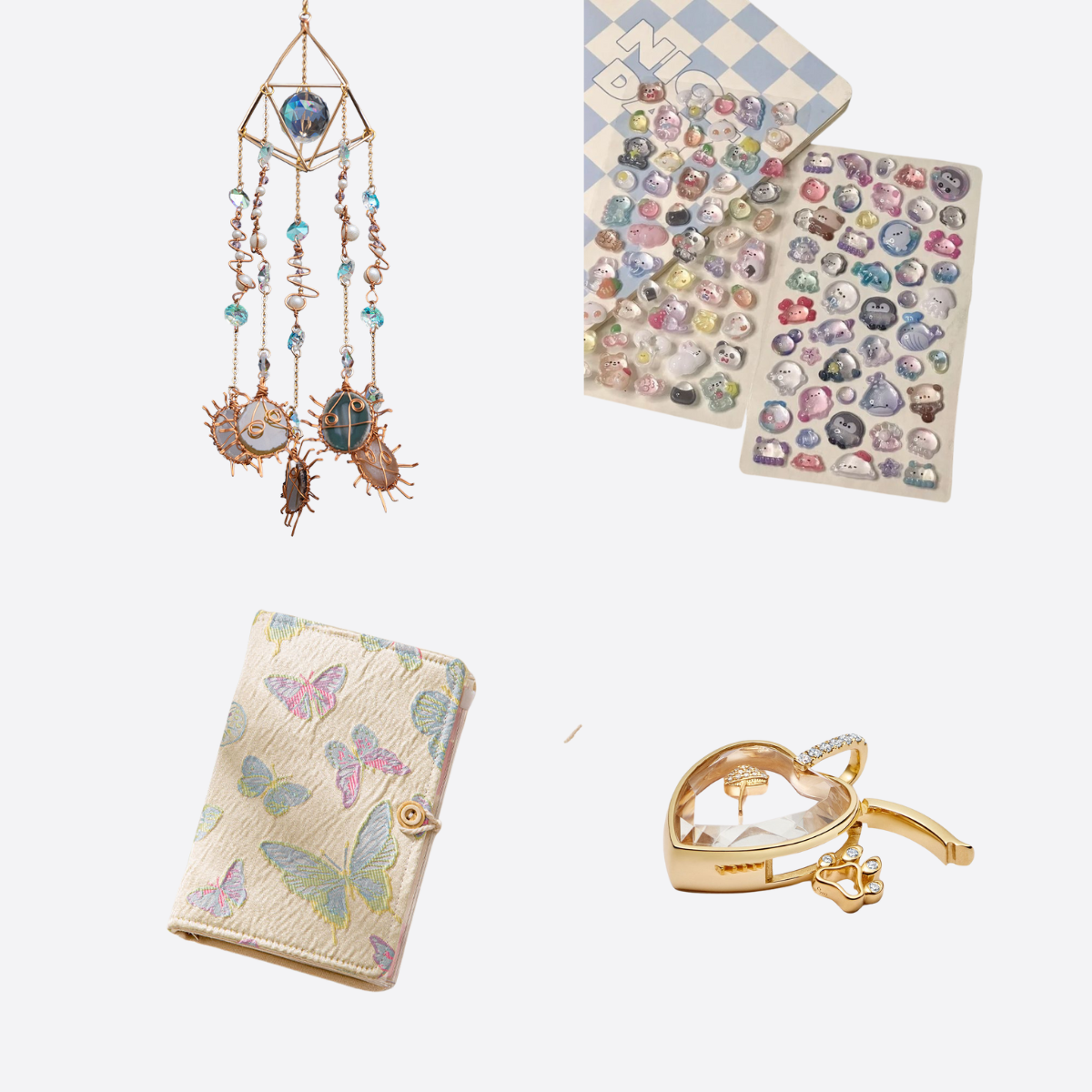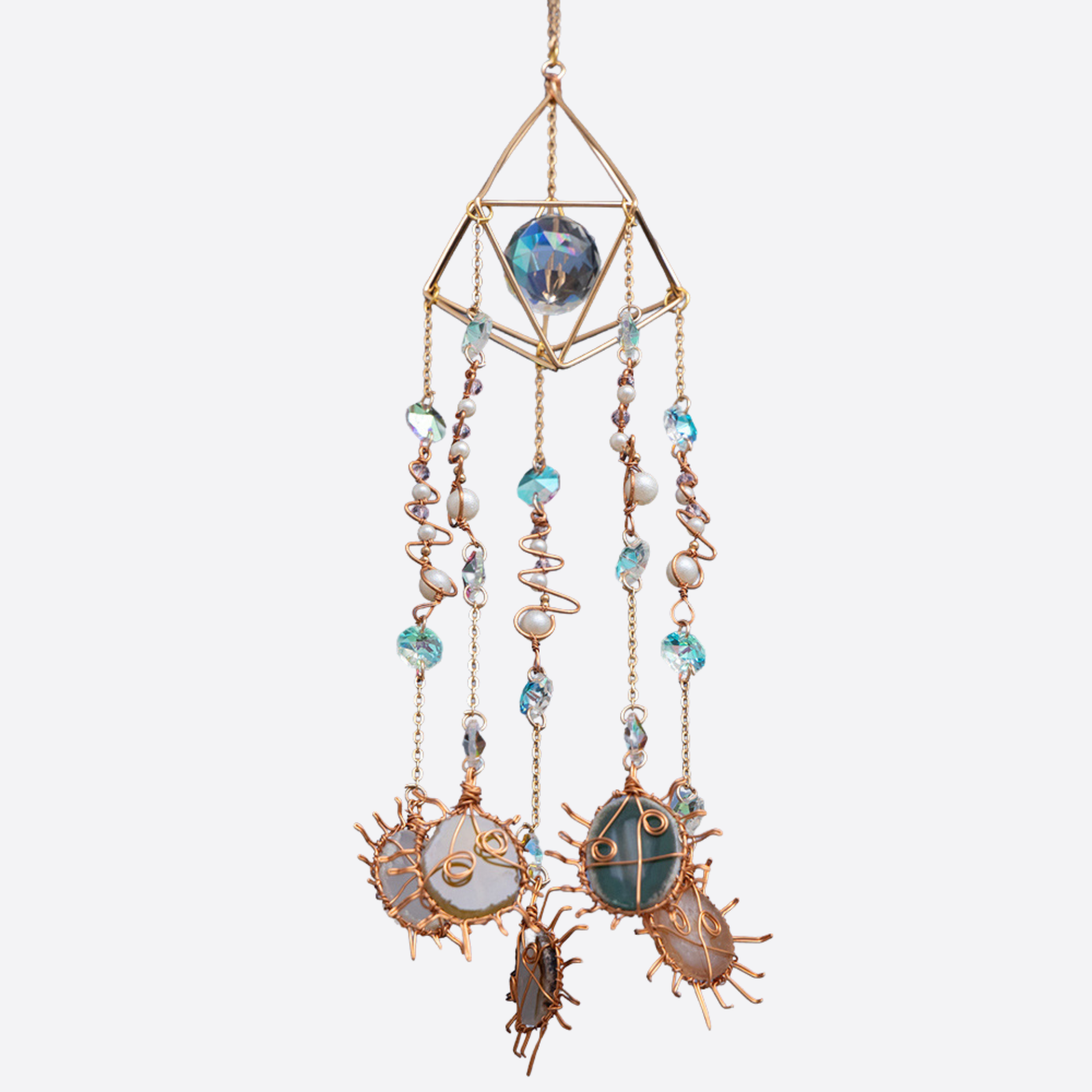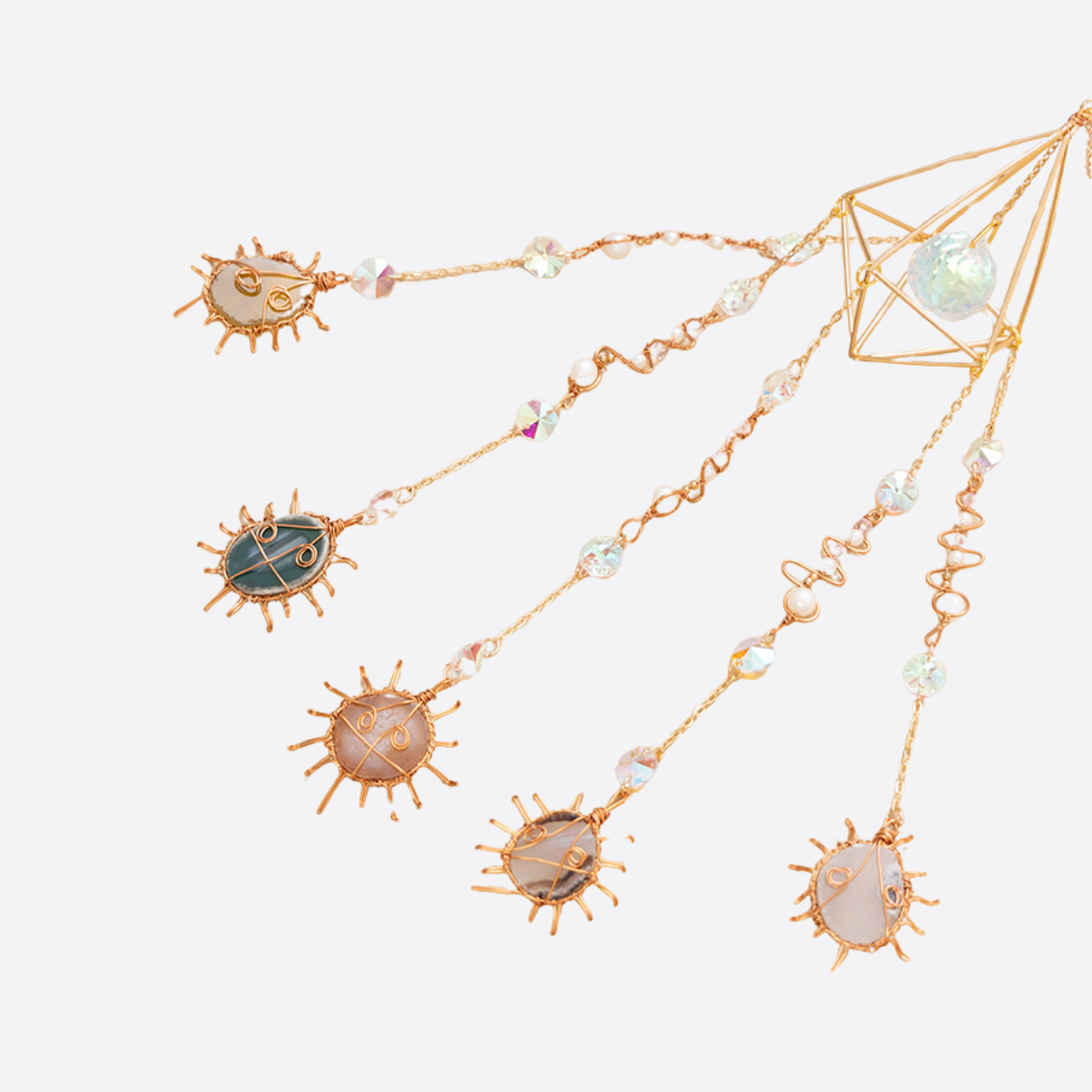 Suspended crystals and delicate wirework channel the morning sun into scattered rainbows, transforming any quiet corner into a moment of awe. Each charm is hand-wrapped, imperfect and radiant, just like us — a celebration of odd beauty and everyday light.