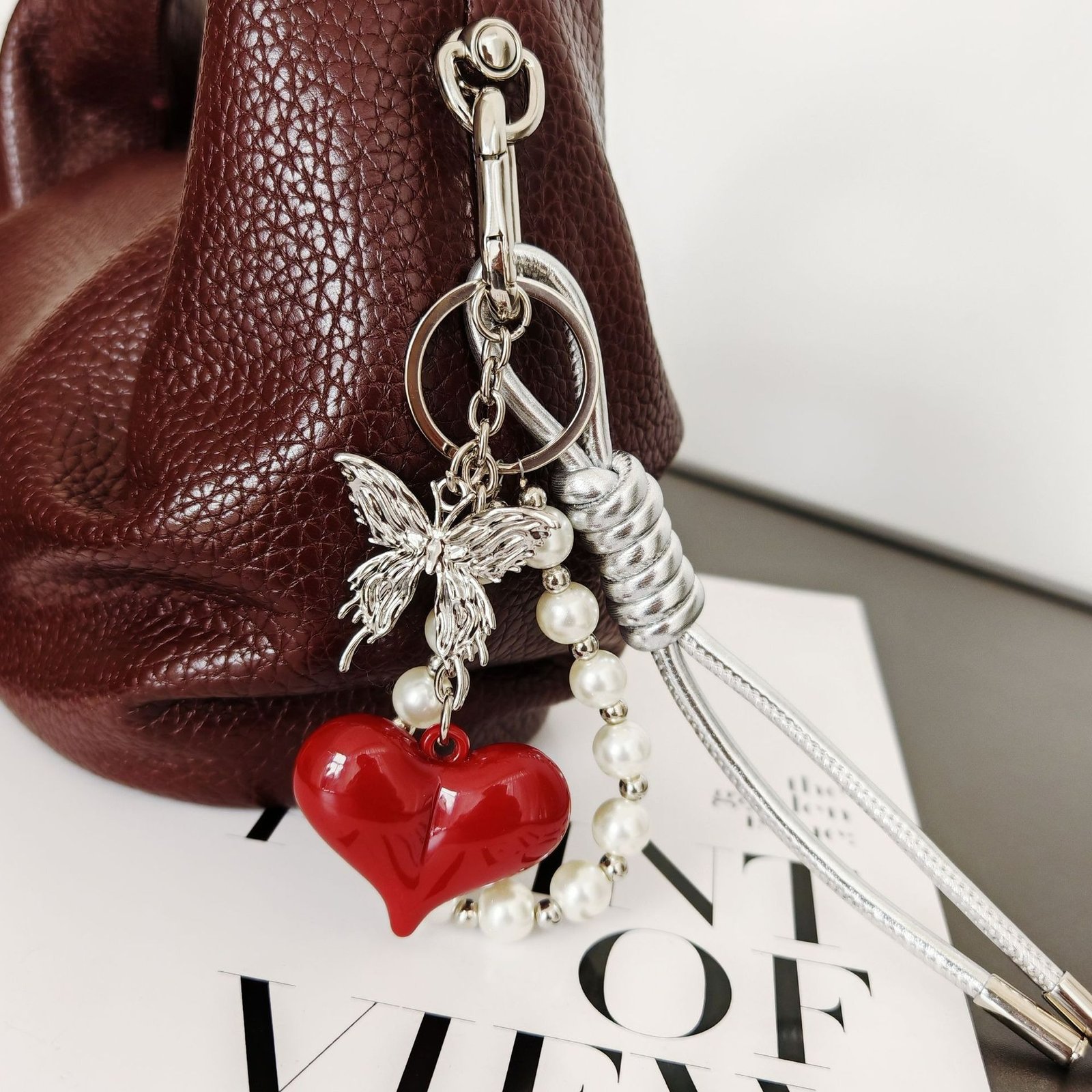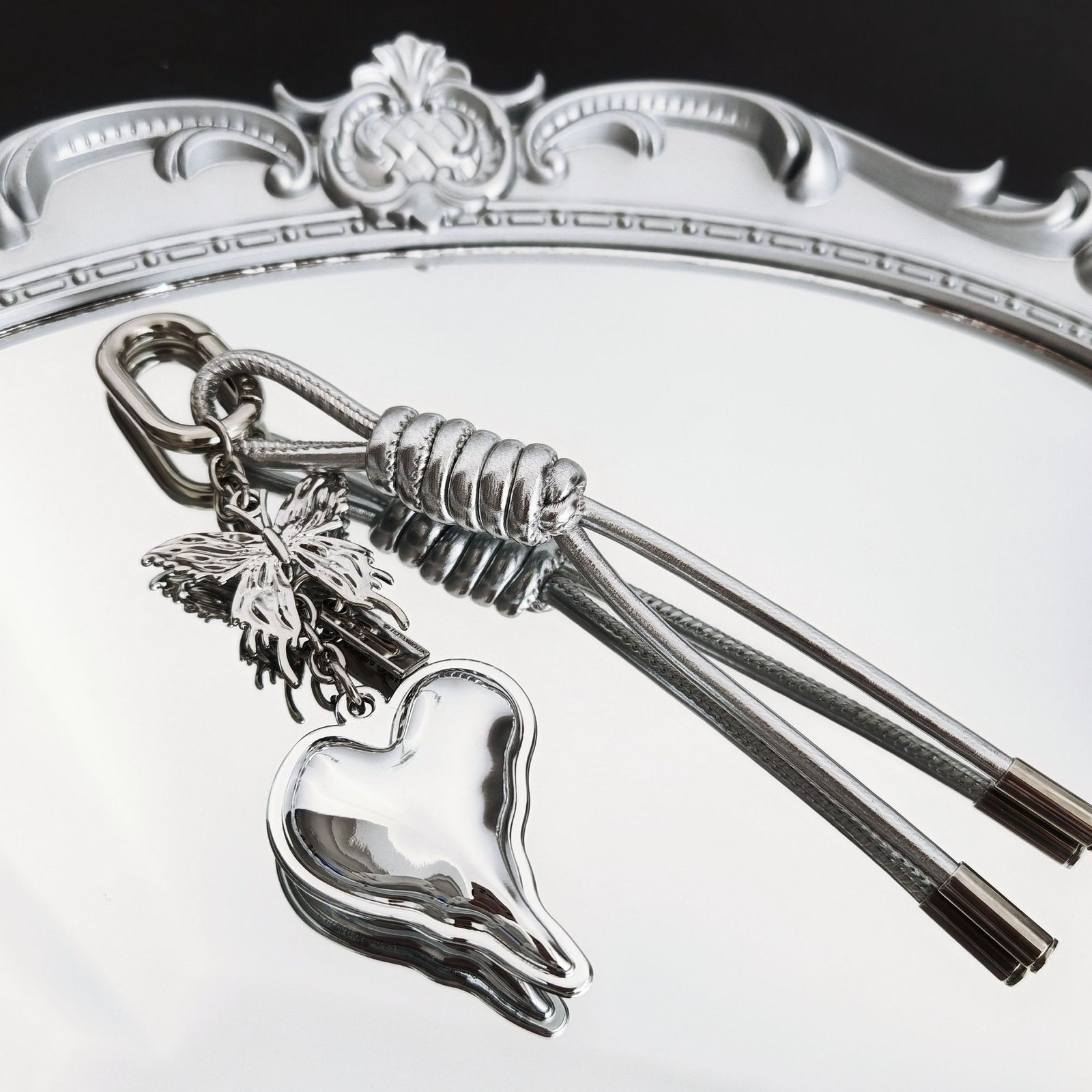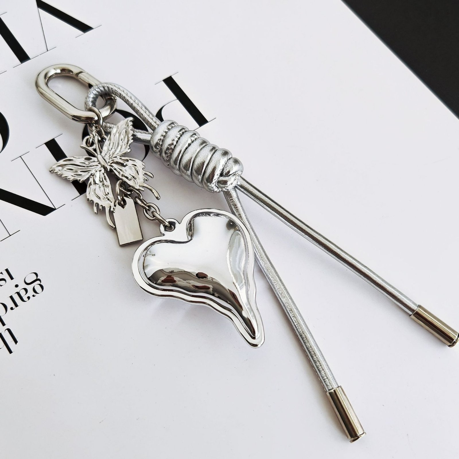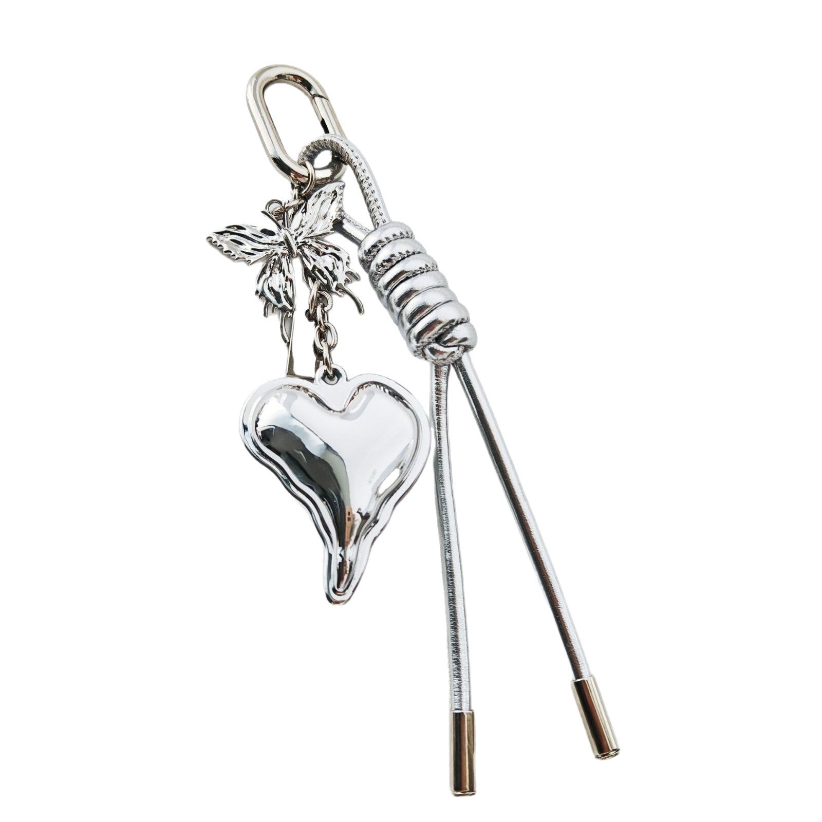 Silver Heart Butterfly Bag Charm – Metallic Aesthetic Keychain with Braided Cord, Minimalist Silver Key Ring Accessory for Purse or Backpack
