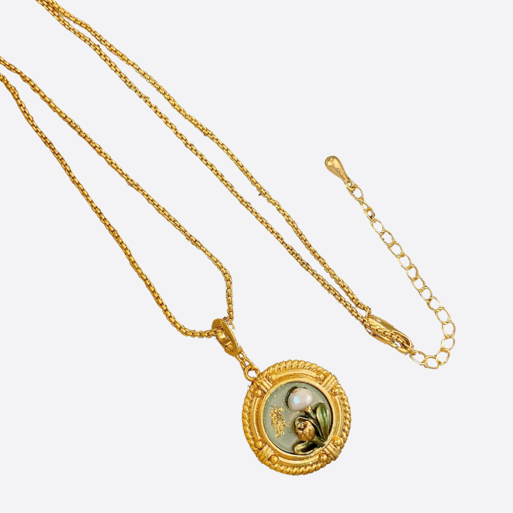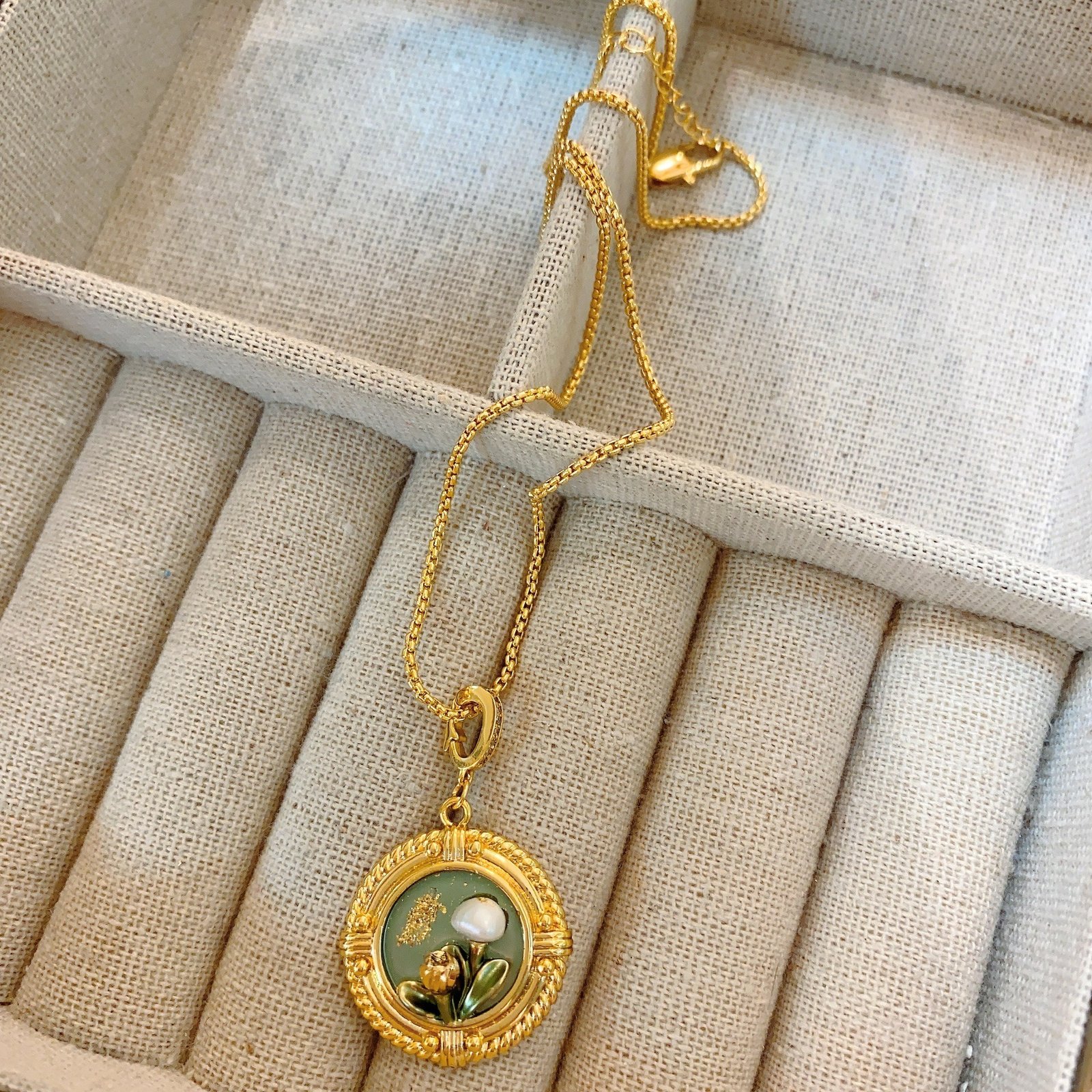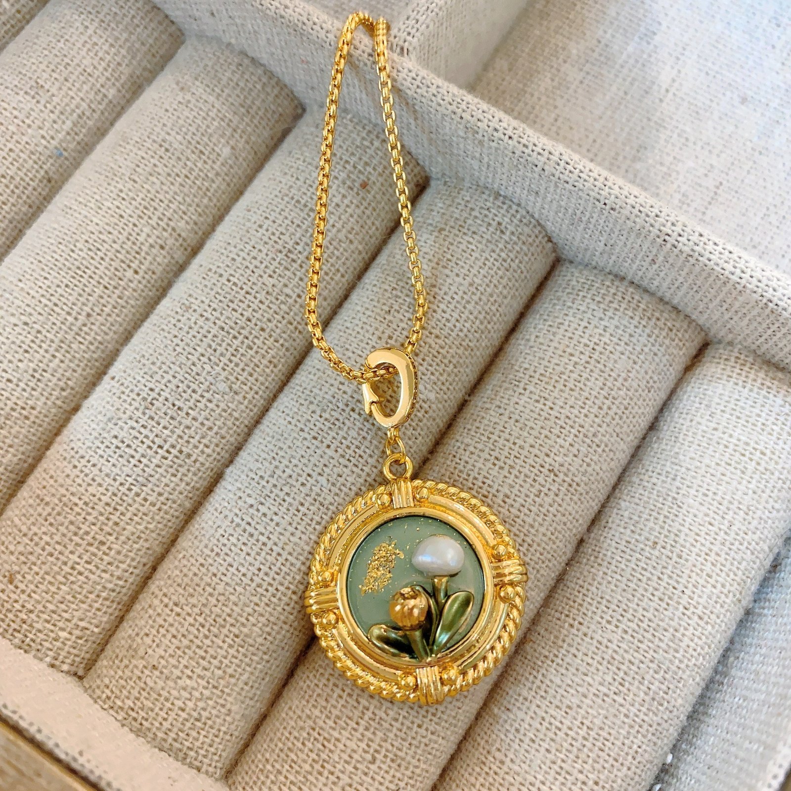 Vintage Baroque Floral Pearl Pendant Necklace – 18K Gold-Plated Chain with Natural Pearl, Hand-Painted Enamel, Elegant Heirloom Choker for Women